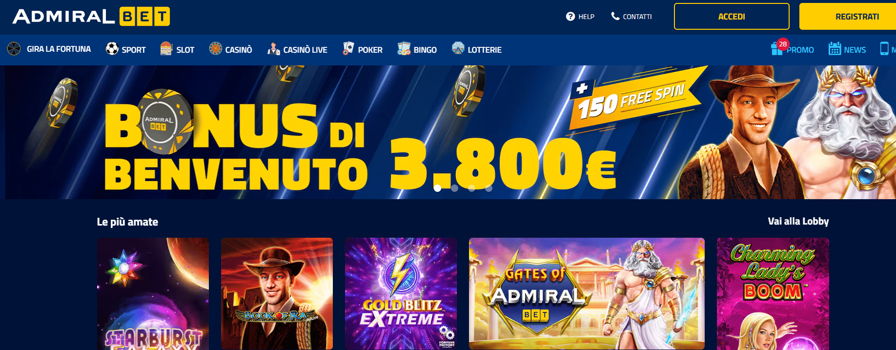 - AdmiralBet – Solida alternativa italiana con licenza ADM, apprezzata per l’interfaccia semplice e i bonus facili da riscattare. Ottima scelta per chi cerca un sito affidabile con quote competitive e palinsesto ben strutturato, soprattutto sul calcio.