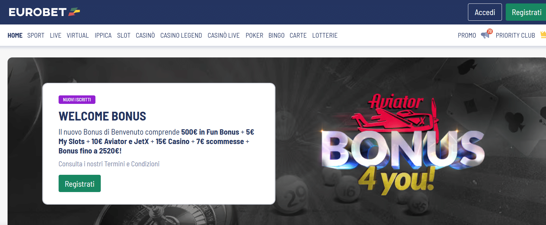 Eurobet offre un'ampia gamma di bonus di benvenuto per i nuovi utenti, tra cui fino a 1.000€ per le scommesse sportive, 500€ di bonus per il casinò, 1.000€ per il poker e fino a 20€ per il bingo. Per attivare queste offerte, è necessario registrarsi, inserire il codice promozionale Eurobet e fare un deposito minimo di 10€.