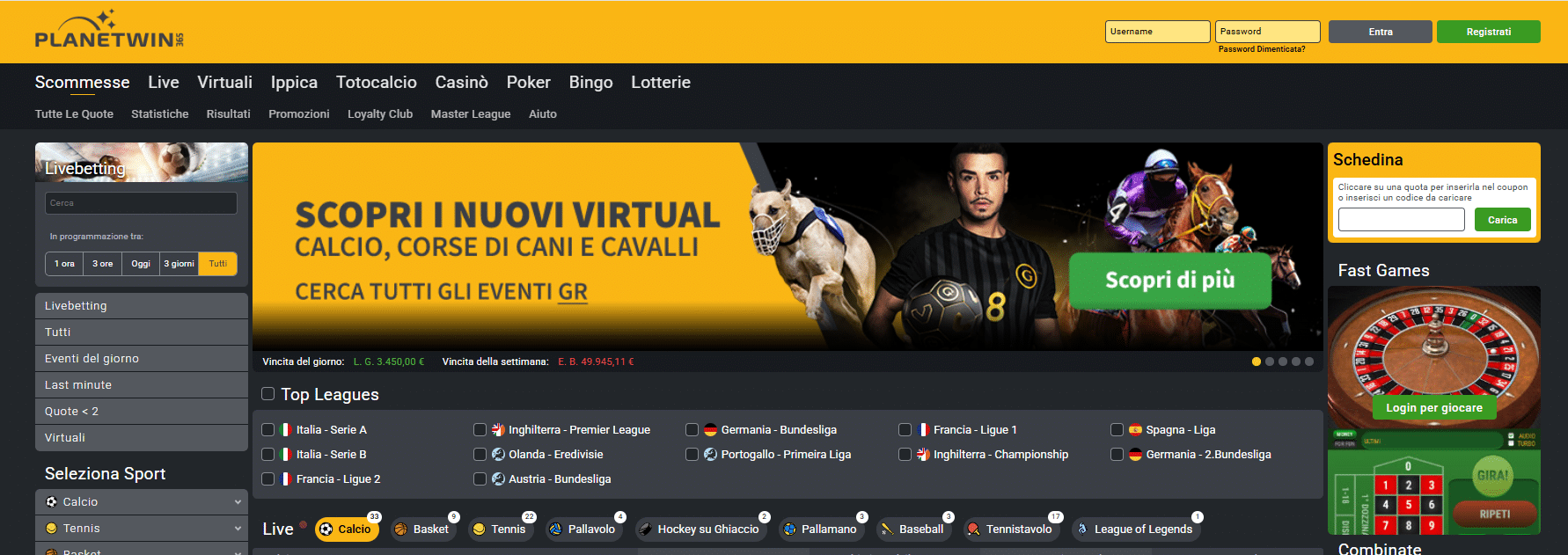 - Planetwin365 – Quote competitive, scommesse calcio con tanti mercati e streaming.